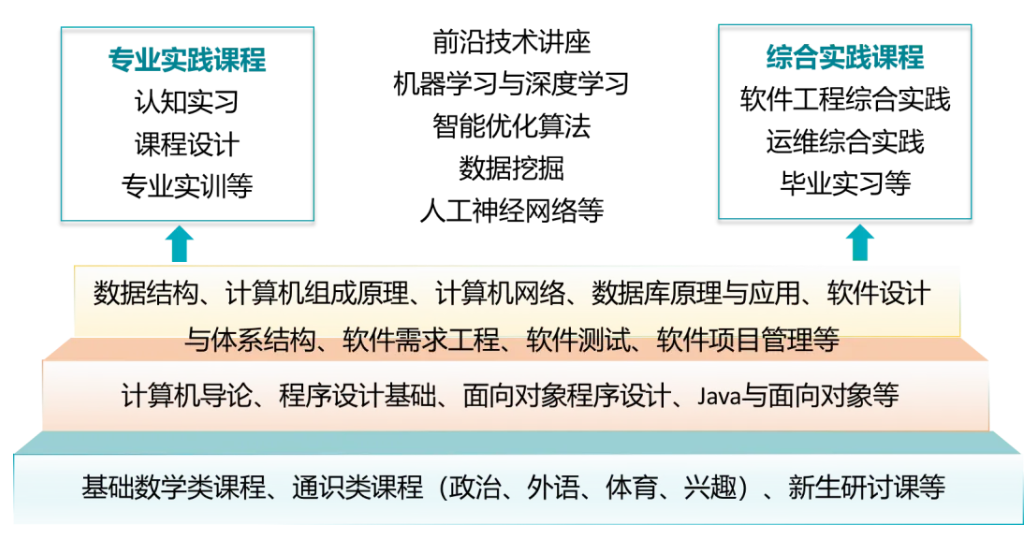 高等数学、线性代数、概率论与数理统计、计算机科学导论、程序设计基础、大学物理、面向对象程序设计、新生研讨课、离散数学、计算机组成原理、软件工程职业素养、数据结构、操作系统、数据库原理与应用、团队激励与沟通、软件设计与体系结构、软件需求工程、计算机网络、软件测试、软件项目管理、软件工程综合实践、运维综合实践等。